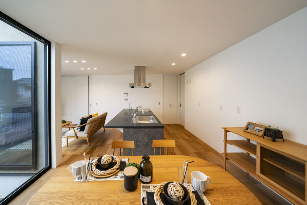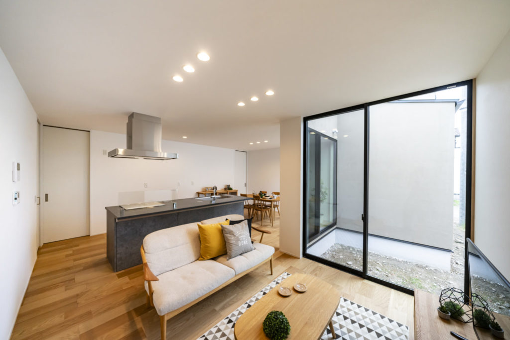 落ち着いた和モダンな佇まい。中庭との一体感があるLDKでより広く感じる空間になっています。