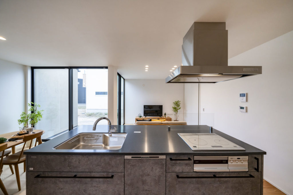 キッチンはLIXIL「オフェリア」を採用した、人気のアイランドタイプ。ストーン調の落ち着いたカラーが、空間全体に上質な大人の雰囲気を演出