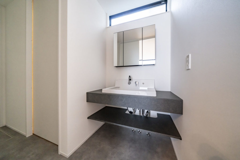 洗面は空間がすっきり見えるフロートタイプを採用。来客も使う設備だからこそ、注文住宅同様に細部までこだわってセレクト