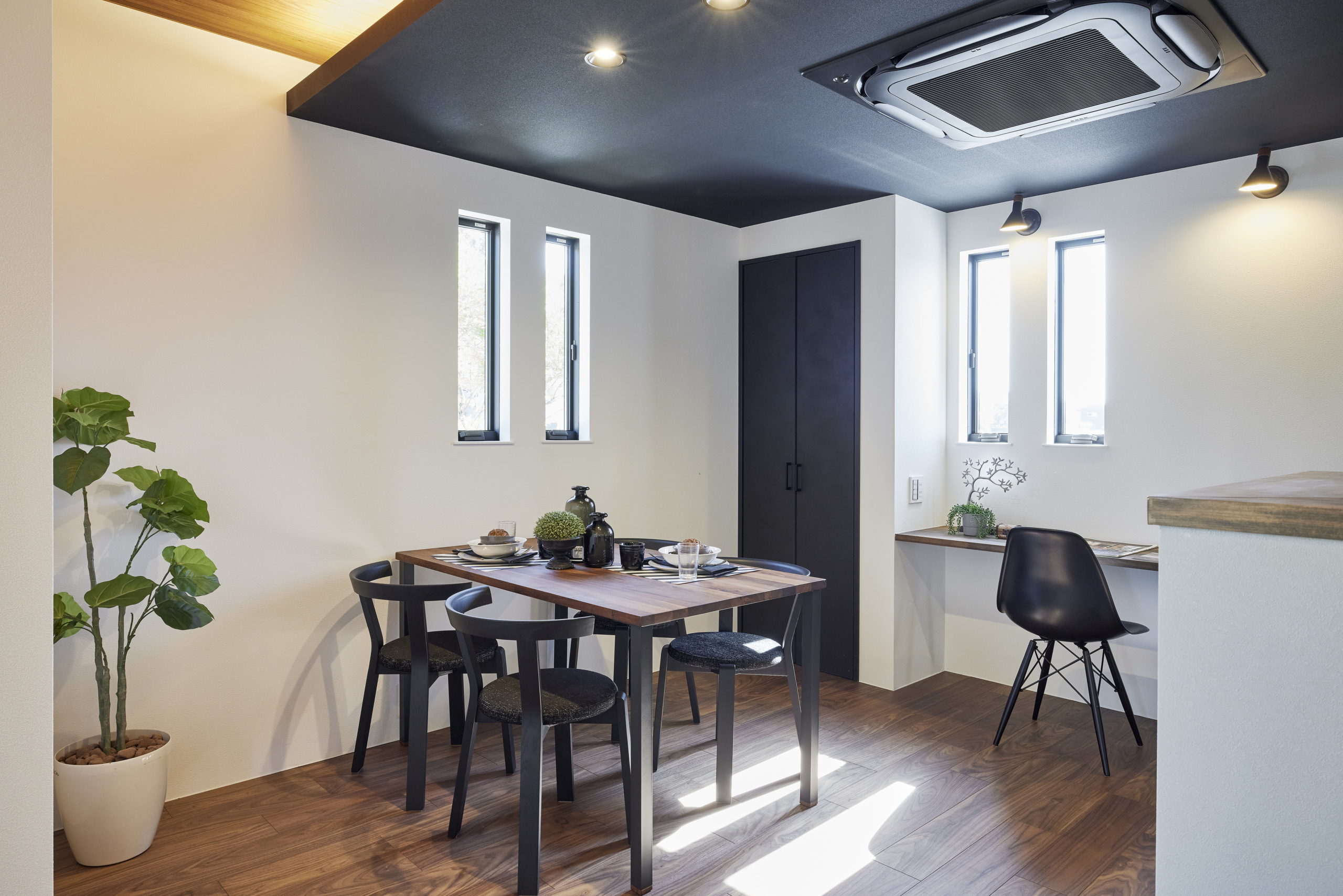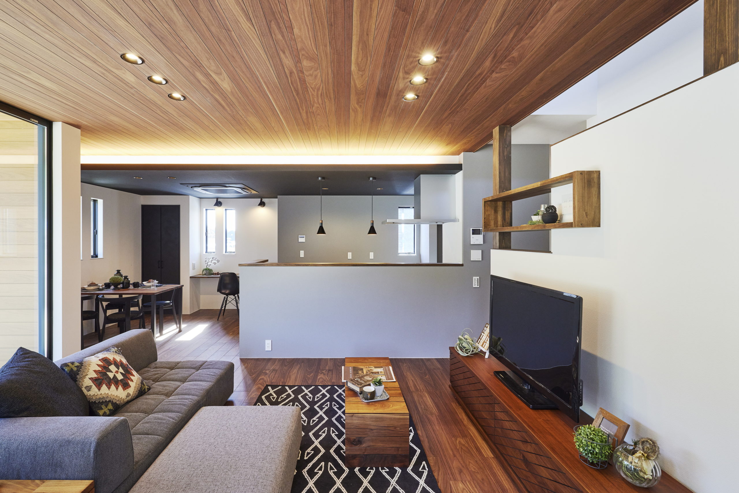 | ポイント | ダイニング下がり天井+間接照明 / ファミリークローゼット / ランドリールーム / シューズクローク / 室内物干し / スロップシンク |